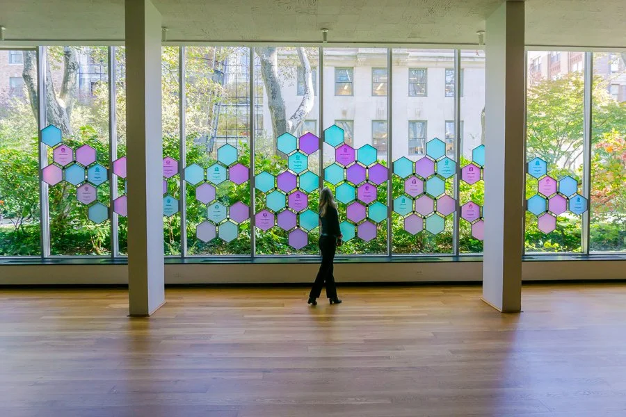 The first wall comprises two sculptural hemispheres build of hundreds of triangular steel plaques, set into two-way complex curves. Face triangles are all the same size to facilitate interchangeability, but the structural triangles of the complex support system of both walls had to be engineered with no two dimensions the same. The system is also entirely magnetic, but doesn’t look it, allowing updates and swaps whenever necessary. On the donor recognition wall, real biomedical research images turned into abstract art can be found close up on all of the donor plaques. Scientific prize plaques each host a custom illustration done in engraving-style dot portraits by Wall Street Journal ‘hedcut’ artists.