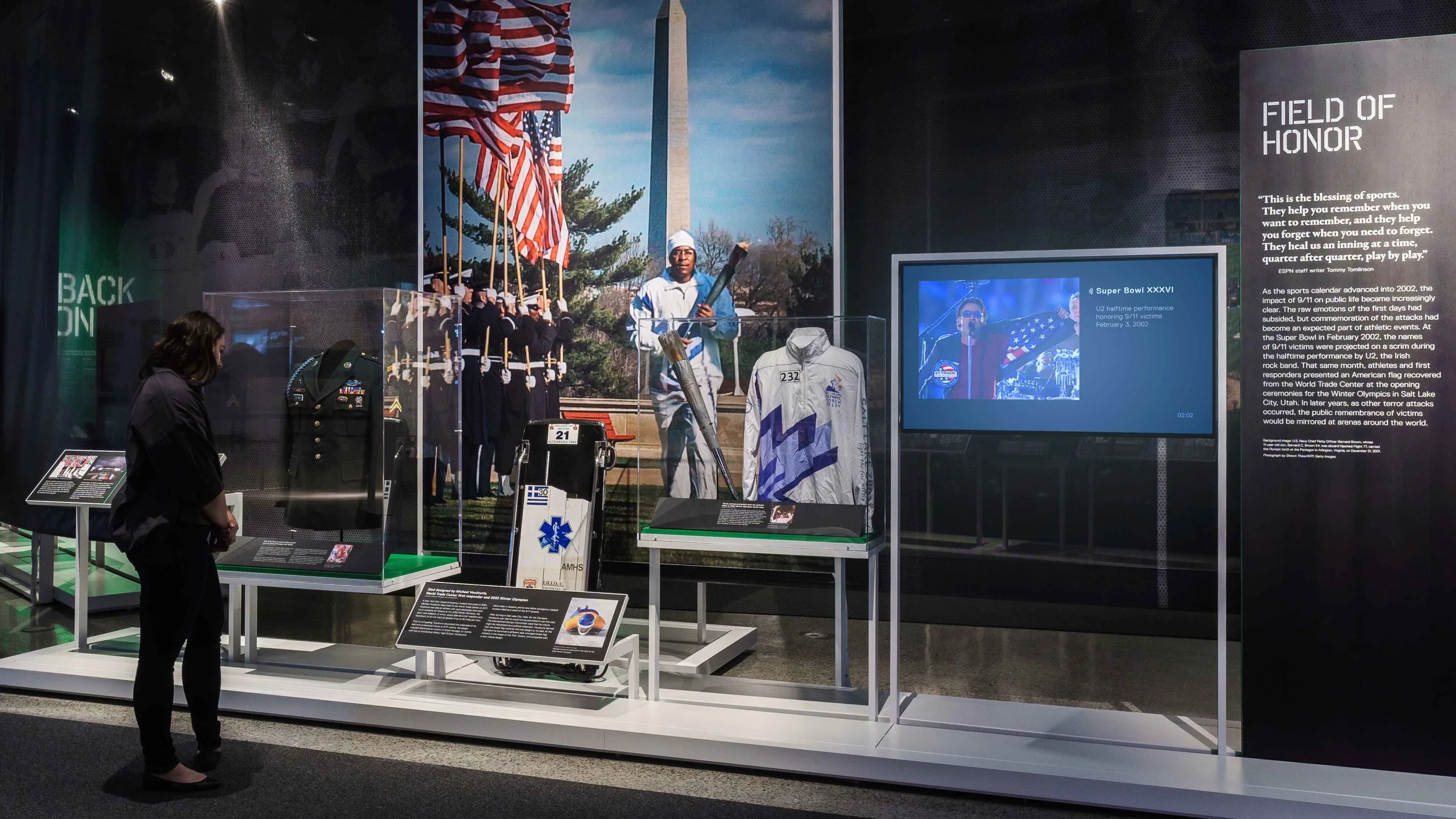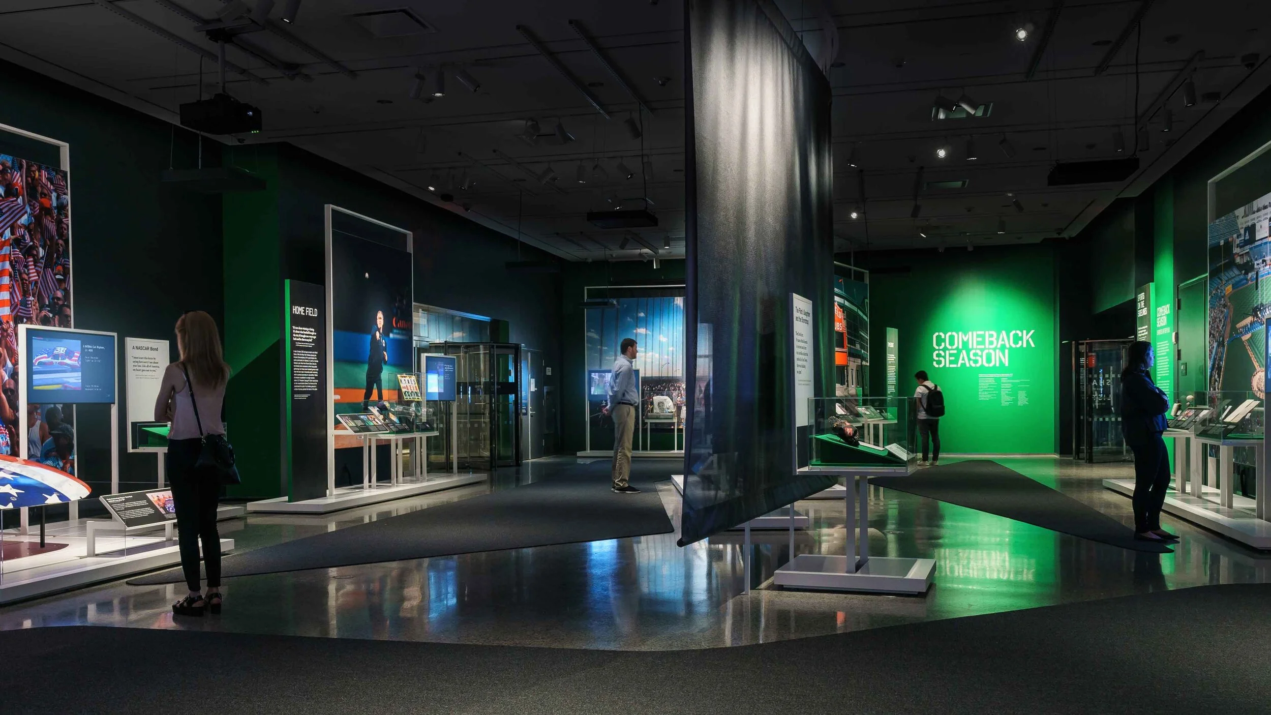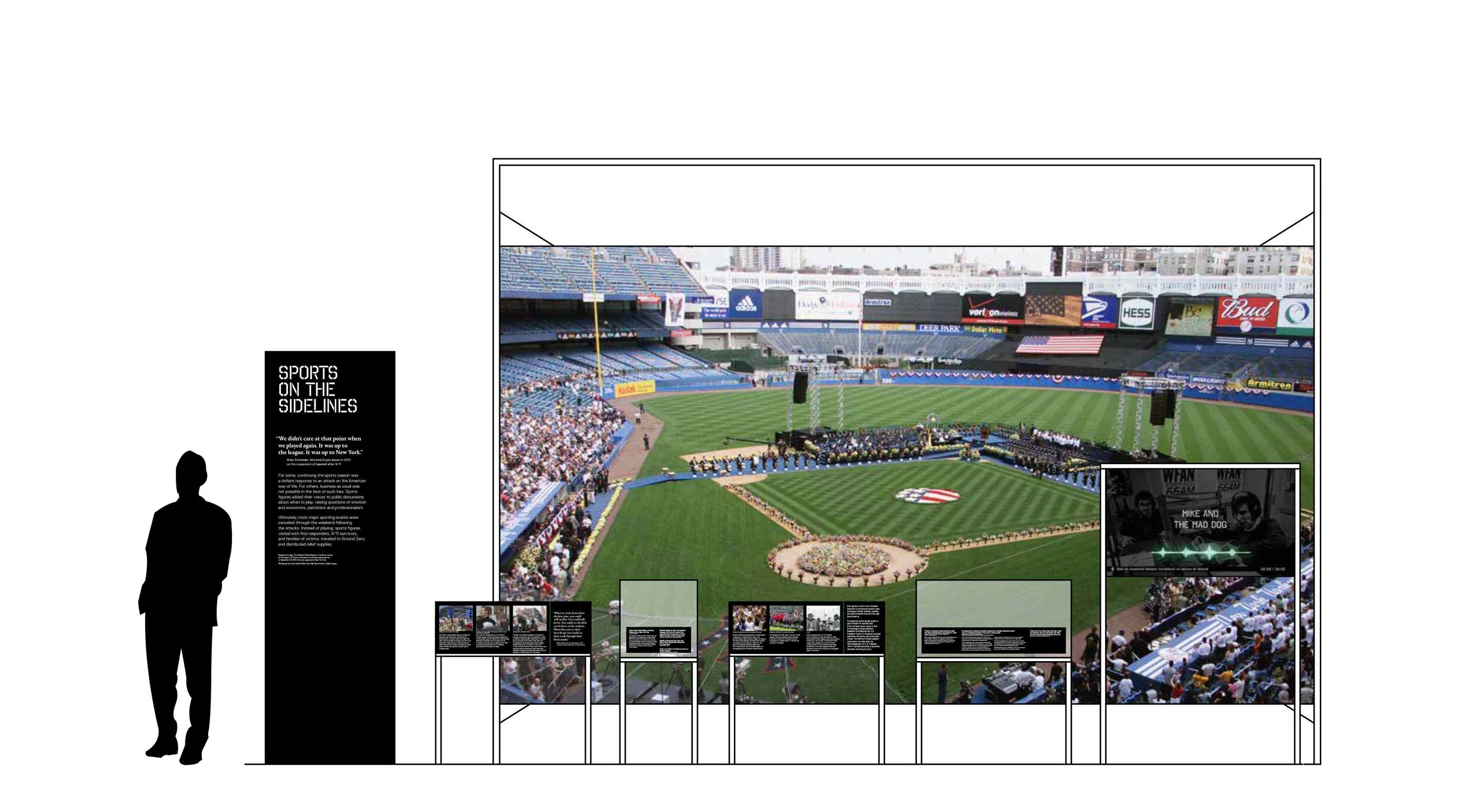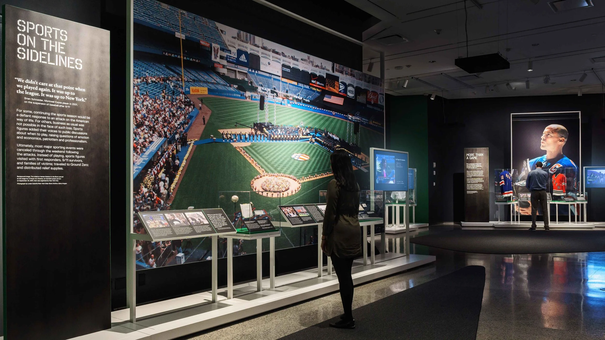 C&G Partners was tasked with the exhibition design, graphic design, and sound & media production for Comeback Season: Sports After 9/11. This is a special exhibition at the 9/11 Memorial & Museum. The emotions of sports crowds at various points after 9/11 is an effective way to frame the story arc, using design gestures to take visitors back to those key moments in stadiums and portray the changing emotions of a whole nation. Working closely with the museum staff, the exhibition was divided into nine sections, with additional stations dedicated to stories of victims and their families. Each section includes dramatically large images, custom short documentaries, objects from the museum’s collection or on loan for the exhibit, and poignant quotes.