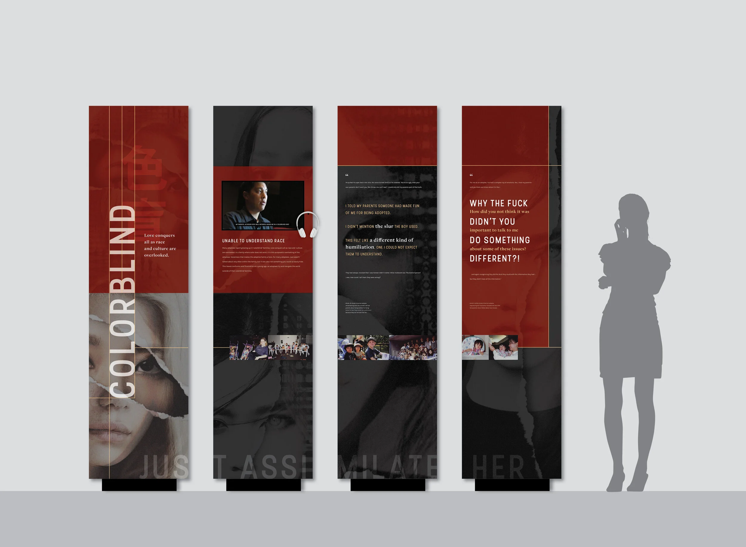 Inbetween is a visual exhibit that discusses the complexities of transracial adoption and reveals the criticisms behind it. This exhibit is a collection of stories from Asian American adoptees that shares how we experience race in the United States. As babies, we are separated from our native culture and placed into American society to be raised by white families. With no connection to our Asian heritage, we must learn how to navigate race in the messy way in which we experience it. We will never be ‘White’ enough, but also never be ‘Asian’ enough. This exhibit will reveal the pain, guilt, and confusion of being torn in-between two cultures, and will explore the harsh realities of transracial adoption.