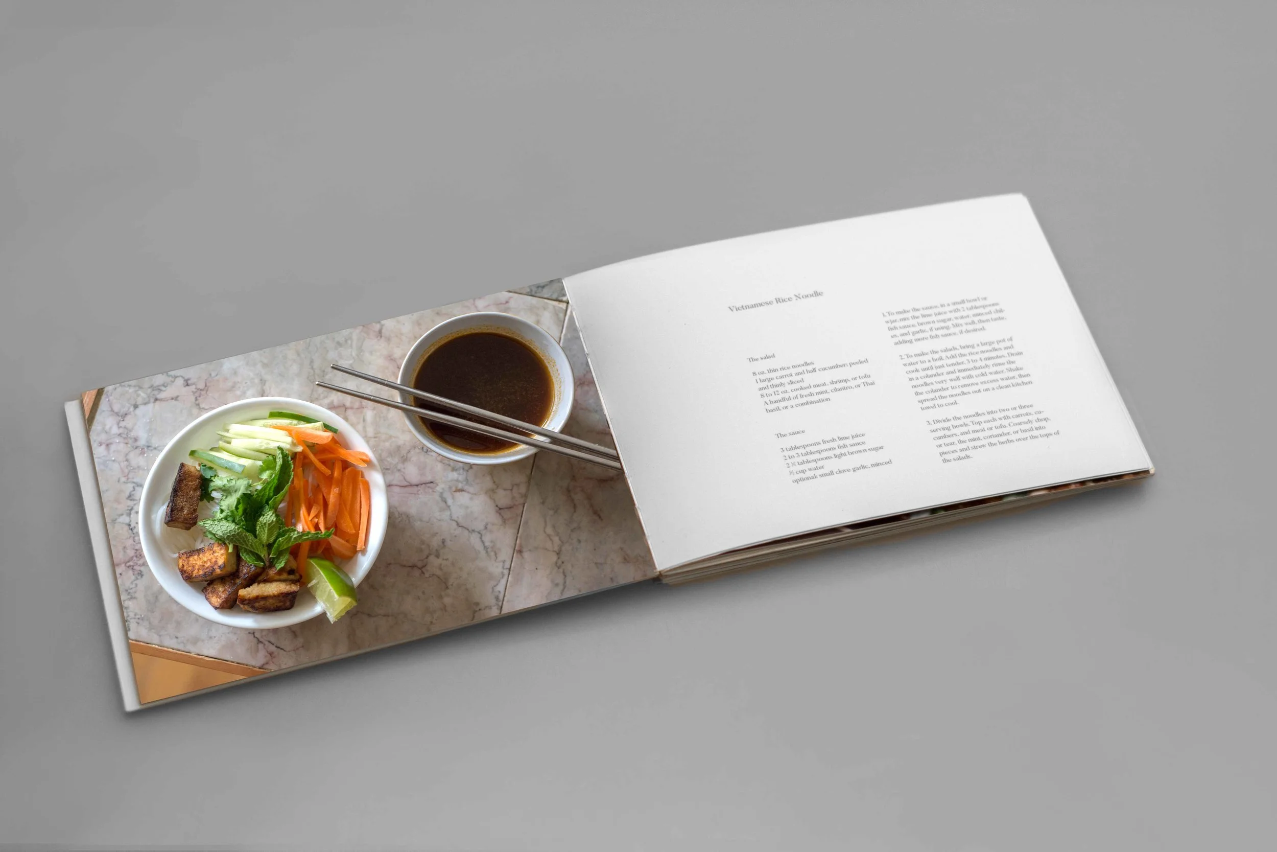 I created a photography book that aims to highlight various types of noodle recipes across the different Asian cuisines. Cooking is a passion of mine, so I only thought it fitting to create an album that reflects this. The book is divided into sections by noodle dish and first captures the ingredients of each recipe. The finished dish is displayed at the end of each section, with the recipe to accompany it. The photographs were then printed and mounted onto each page. These pages were hand-stitched together with a delicate vellum sleeve as a final touch. This book was hand-stitched so the hand craft of cooking is conveyed through its exterior as well as interior.