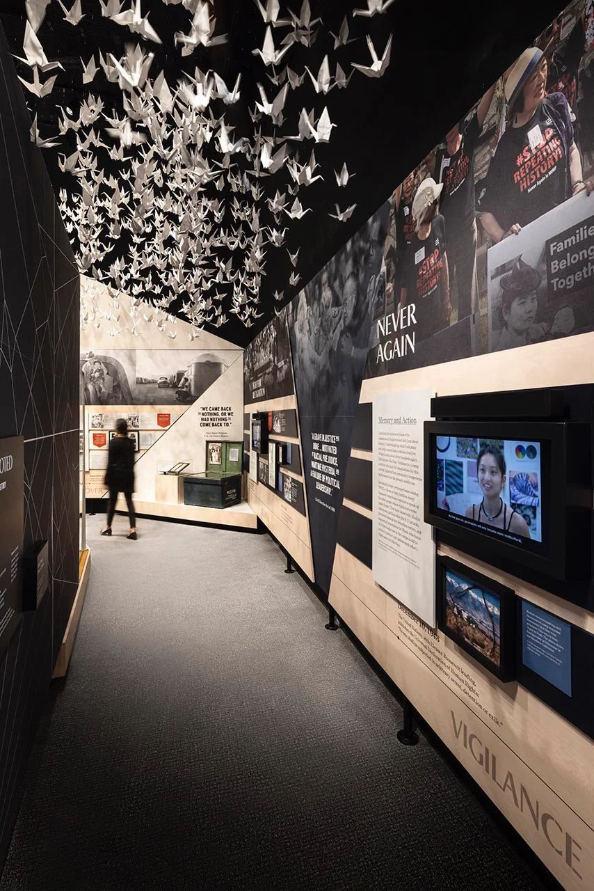 This is a permanent exhibit created for the California Museum. We worked closely with experts and docents to ensure that the story was told in a compelling way. The exhibition, redesigned by our team at C&G Partners, focuses on the incarceration of over 127,000 Japanese Americans. The exhibit uses interactive oral histories, scale models, 1:1 recreations of the camps, and poignant personal memorabilia to ground the story in reality. The cloud of 1,000 tsuru — cranes — floats over the exhibition, expressing a wish that this kind of atrocity will never happen again.
